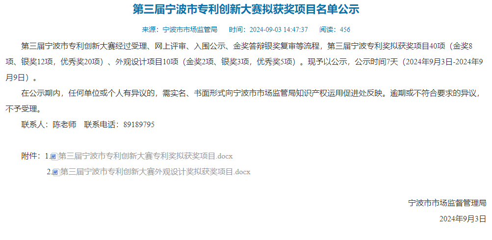 喜訊 | 我院一項專利發(fā)明榮獲第三屆寧波市專利創(chuàng)新大賽專利優(yōu)秀獎發(fā)布日期:2024.09.18