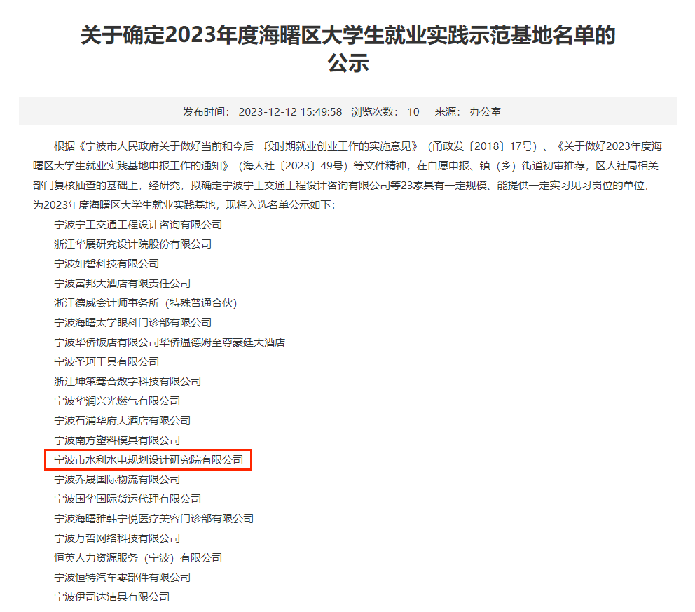 喜報(bào) | 我院獲評(píng)2023年度海曙區(qū)大學(xué)生就業(yè)實(shí)踐示范基地發(fā)布日期:2023.12.21
