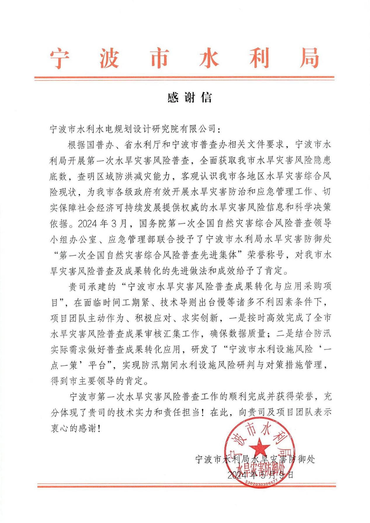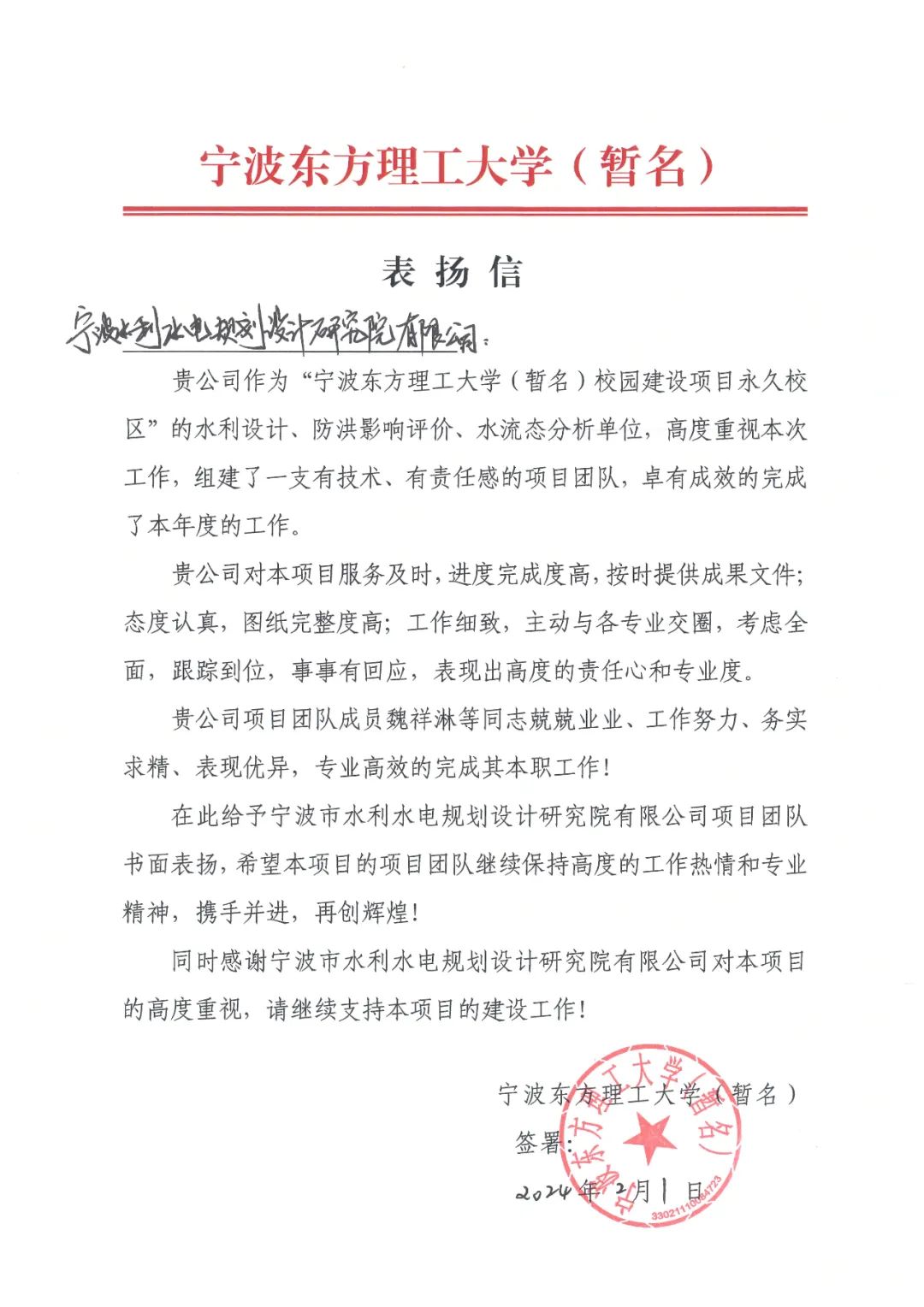 憑借上述三個重大項(xiàng)目中的出色表現(xiàn),我院分別收獲來自寧波市水利局、寧波東方理工大學(xué)和龍游縣林業(yè)水利局發(fā)來的感謝信。這不僅是對我院專業(yè)能力和敬業(yè)精神的高度認(rèn)可,更激勵著我院在未來持續(xù)奮進(jìn),為更多項(xiàng)目貢獻(xiàn)力量。