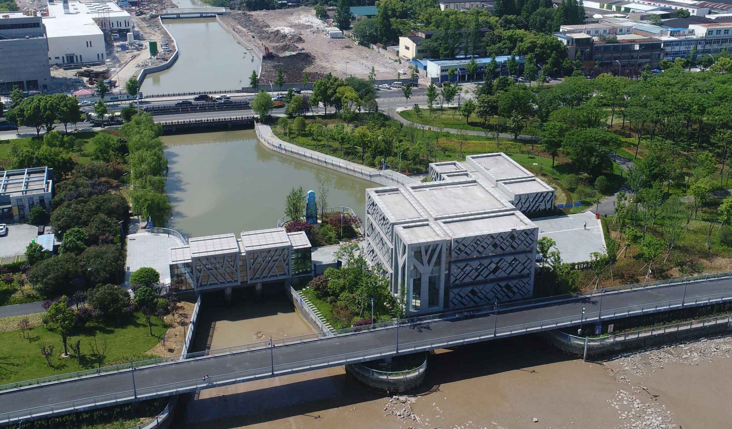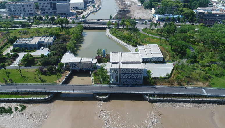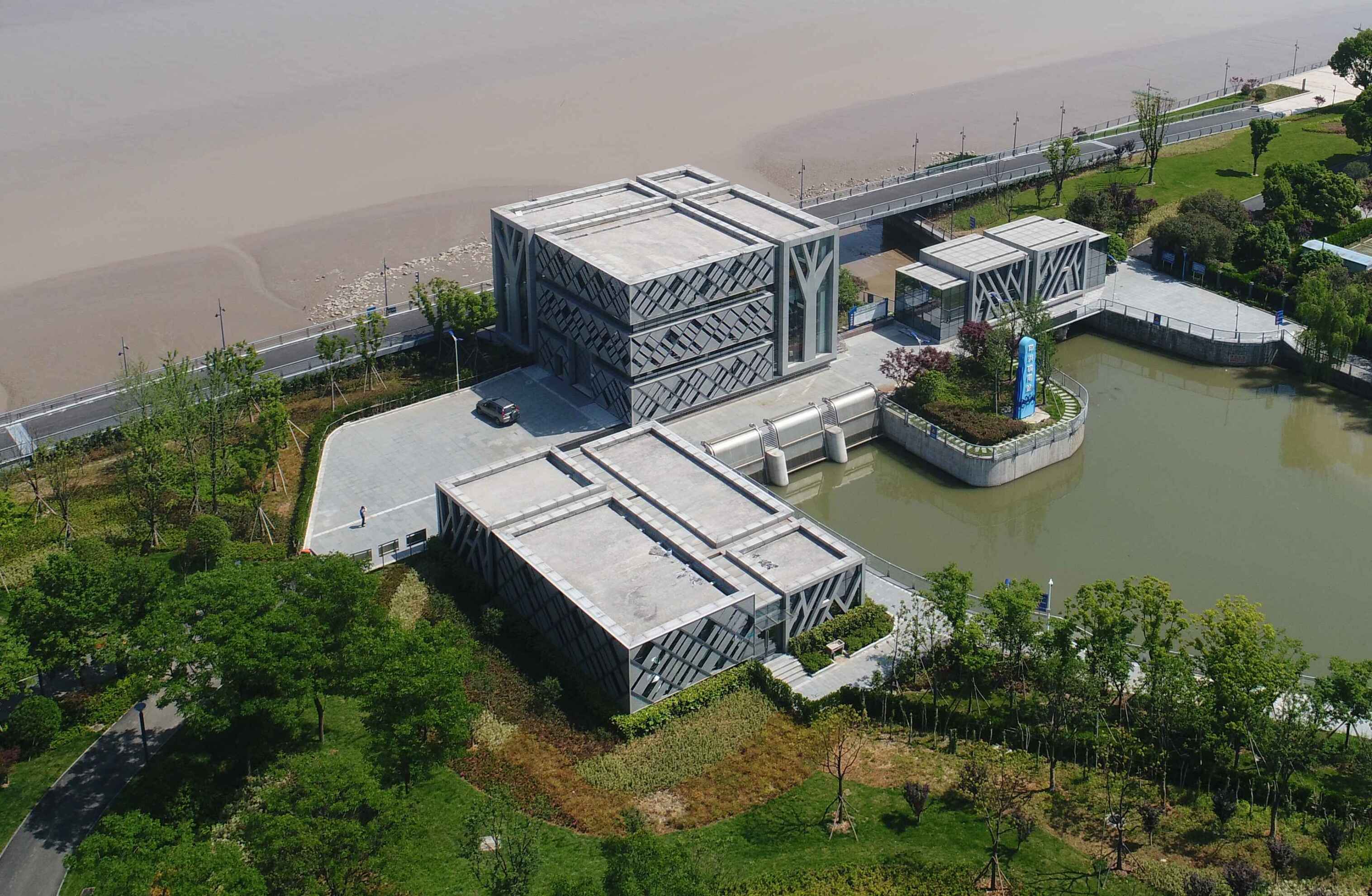 工程通過抽象手法,將樹、落葉等元素融入到建筑表情之中,從而閘站更像是沿江公園里面的雕塑,通過虛實的結(jié)構(gòu)處理,弱化了高大廠房結(jié)構(gòu)的厚重感。