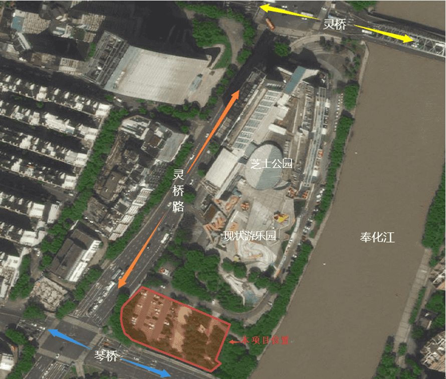 項(xiàng)目地塊位于芝士公園南側(cè),東臨奉化江,南鄰琴橋,西臨靈橋路,北至現(xiàn)狀游樂(lè)場(chǎng)。芝士公園位于寧波市海曙區(qū)靈橋路768號(hào),處于寧波核心地段三江口,臨近奉化江,對(duì)內(nèi)對(duì)外交通十分便利,區(qū)域優(yōu)勢(shì)明顯。