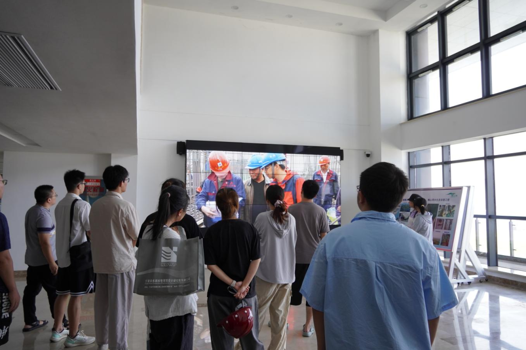 梅山灣外,銀浪拍岸;梅山灣內(nèi),碧波含翠。首先,研學(xué)隊(duì)伍到達(dá)梅山灣建設(shè)管理中心,跟隨工作人員登樓參觀,眺望南堤樞紐及附近設(shè)施,聆聽工程總體建設(shè)情況,并觀看宣傳片,了解該工程的誕生始末。