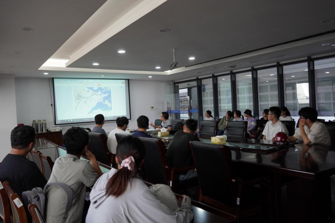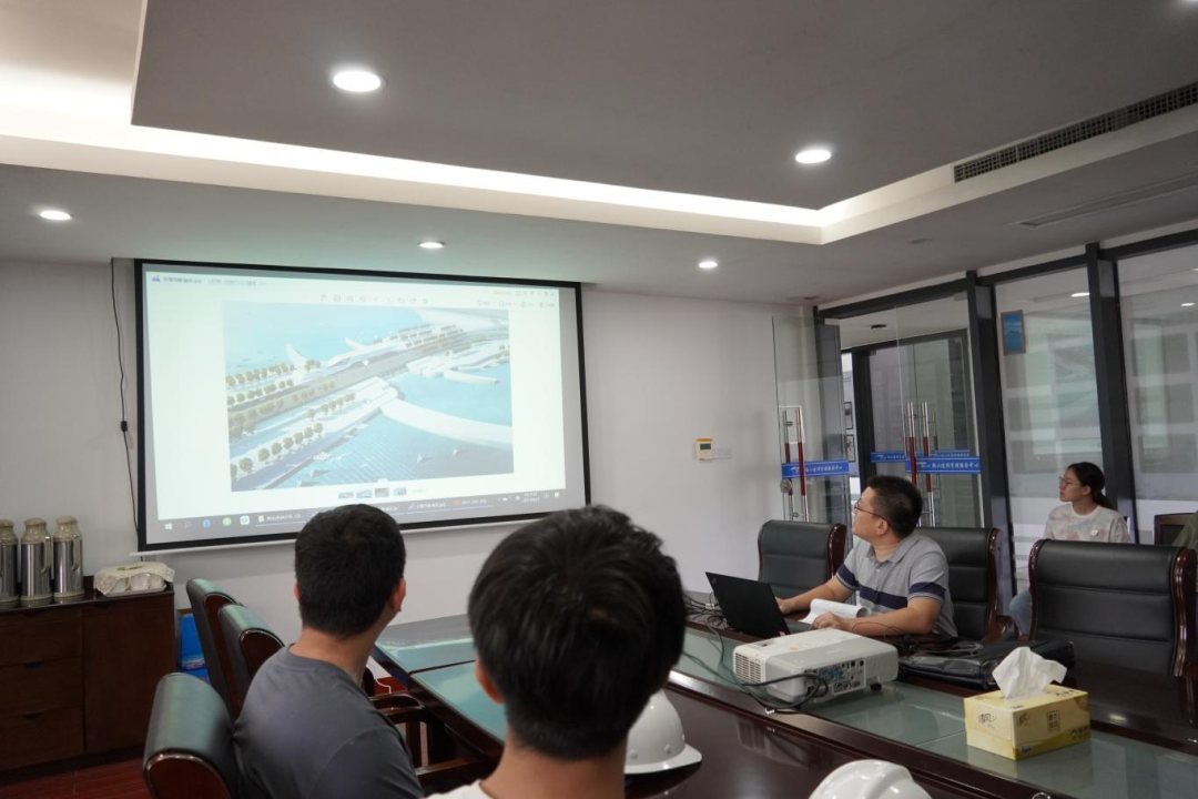 接著,研學(xué)隊(duì)伍來到會議室,胡經(jīng)理結(jié)合建設(shè)目標(biāo)、工程建設(shè)客觀因素、工程效益和景觀效果,詳細(xì)講解設(shè)計(jì)思路、問題對策和創(chuàng)新點(diǎn),為大家上了一堂嚴(yán)謹(jǐn)生動的復(fù)盤課。比如海堤采用緩坡入海,外側(cè)采用異形結(jié)構(gòu)塊消浪,內(nèi)坡采用生態(tài)水工磚美化,使海堤具備結(jié)構(gòu)和生態(tài)景觀雙重效果;船閘與海堤銜接段軟土處理采用新型技術(shù)應(yīng)用——樁網(wǎng)復(fù)合地基,形成“樁-網(wǎng)-土”協(xié)同工作共同承載的復(fù)合工藝。在座職工認(rèn)真聆聽梅山灣如何從曾經(jīng)的“漲潮黃沙水,落潮滿目泥”到如今的“水清、岸綠、波寧、潮平”,受益匪淺。