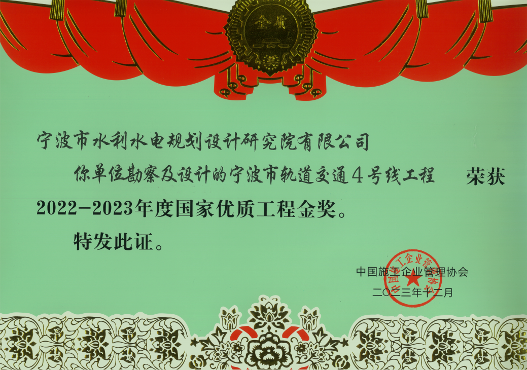 2023年我院多個項目在各類評比中脫穎而出,榮獲中國水利工程優(yōu)質(zhì)(大禹)獎、國家優(yōu)質(zhì)工程金獎、全國優(yōu)秀工程咨詢成果三等獎、浙江省水利科技創(chuàng)新獎、浙江省水土保持學(xué)會第三屆優(yōu)秀設(shè)計三等獎、“浙江省文明標化工地”稱號、2023 年度寧波市建設(shè)工程優(yōu)秀勘察設(shè)計獎、2023年度寧波市“甬江建設(shè)杯”優(yōu)質(zhì)工程獎、寧波市水利科技創(chuàng)新獎、寧波市水利學(xué)會優(yōu)秀論文獎等各類榮譽20余項。
