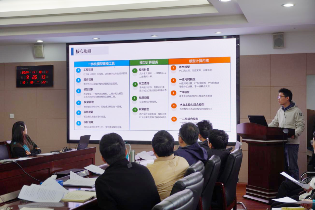 隨后,平臺研發(fā)團隊代表陳龍贊對“澤圖水文水動力一體化模型平臺”進行詳細介紹,并進行現場實操演示。該平臺是一套我院自主研發(fā)的以組件化建模、并行化求解、在線化計算、一體化耦合、國產化支持為核心的水文水動力模型平臺,能夠滿足包括產匯流計算、水庫調度、一維河網、二維淹沒、水文水動力耦合、一二維水動力耦合在內的多種模擬需求,適用于獨立部署、嵌入第三方項目等多種應用場景。基于建模工具、模型服務、計算核心三分離的設計架構,平臺具備分布式部署、集群化管理、多節(jié)點負載均衡的動態(tài)能力,滿足靈活適用多種尺度的計算需要。